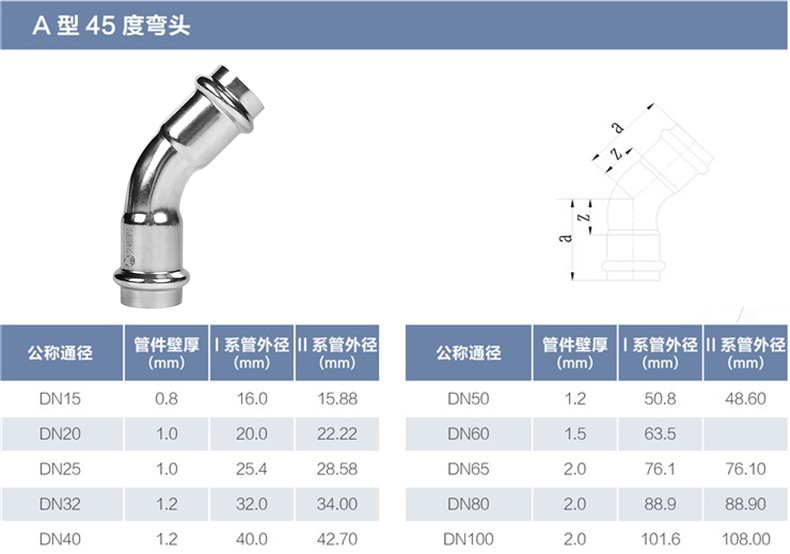 A型45度彎頭丨材質(Grade): 304/304L、316L 丨原料來源(Source of raw materials): 全部符合相關國家標準要求,用料來源酒鋼、太鋼、張浦、東特等 丨焊接方式(Welding method): 氬弧焊或等離子焊(TIG OR PLASMA在線)+氬弧焊(TIG離線) 丨執行標準(Executive standard): GB/T 19228.2-2011 GB/T12771 丨參數對照表(Parameters):