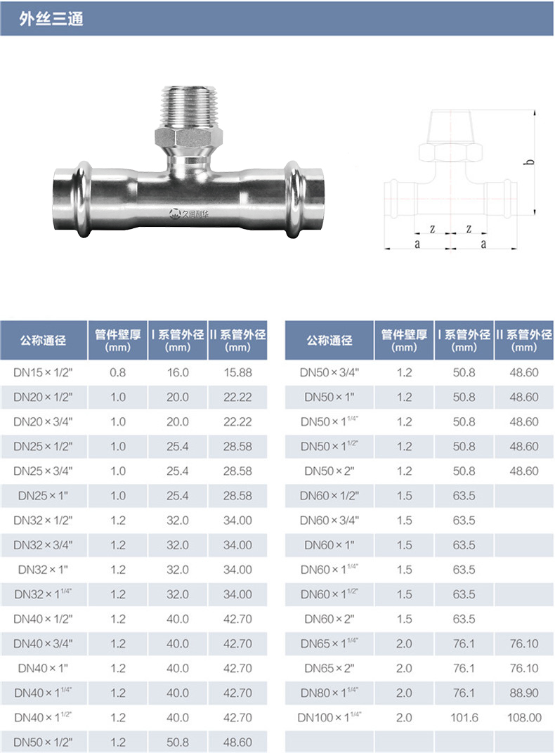 外絲三通丨材質(Grade): 304/304L、316L 丨原料來源(Source of raw materials): 全部符合相關國家標準要求,用料來源酒鋼、太鋼、張浦、東特等 丨焊接方式(Welding method): 氬弧焊或等離子焊(TIG OR PLASMA在線)+氬弧焊(TIG離線) 丨執行標準(Executive standard): GB/T 19228.2-2011 GB/T12771 丨參數對照表(Parameters):